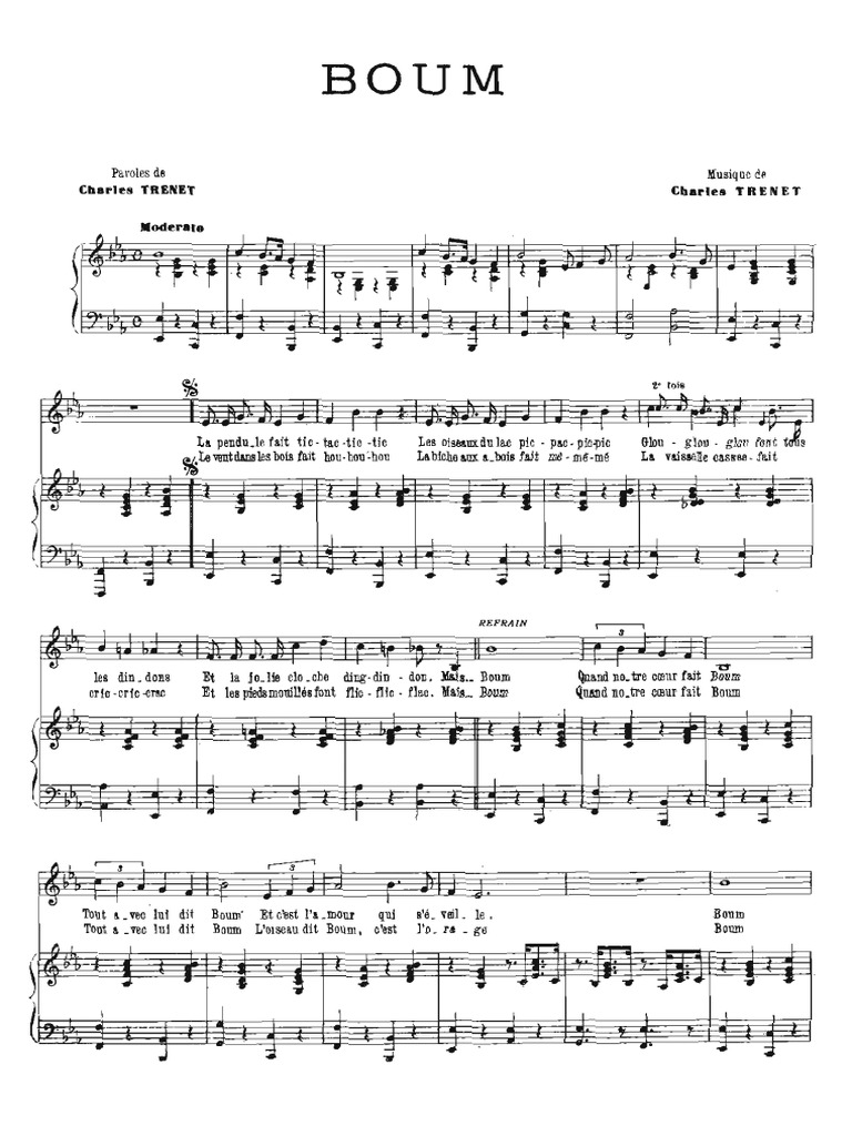 La pendule fait tic tac tic tac les oiseaux du lac font pic pic pic pic glou glou glou font tous les dindons et la jolie cloche ding din. bum, onomatopoeia similar to boom in english) is a popular 1938 song by the french singer/songwriter charles trenet which won him the grand prix du disque. Complete list of charles trenet music featured in movies, tv shows and video games. Let us know what's wrong with this preview of boum by charles trenet. Les oiseaux du lac font pic pic pic pic. It is a perfect song with a perfect arrangement performed by a perfect vocalist. I first heard charles trenet on the enchante sampler. Charles trenet boum on wn network delivers the latest videos and editable pages for news & events, including entertainment, music, sports, science and more, sign up and share your playlists. These include la mer, boum! and y'a d'la joie. Has to be the happiest tune ever recorded. Il faut garder quelques sourires this series of 4 shows will be about charles trenet. French singer/songwriter 'charles trenet' sings a delightful melody. Watch the video for boum.!